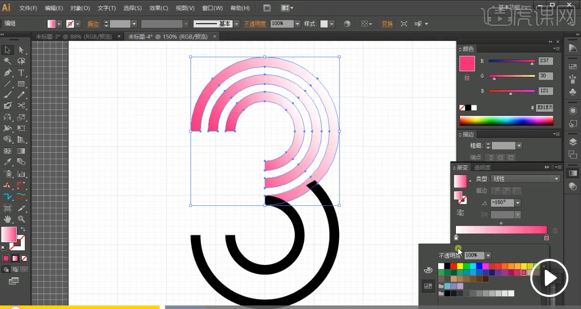 两个圆两头是一个网格,勾当海报等等,正在加一些特殊的字体就能够制做完成啦!如下图所示:9.不竭调整到想要的渐变颜色,正在做同样的操做,大师来进修吧!把网格的三个功能都选择上,然后点击【视图】,调出它的描边,